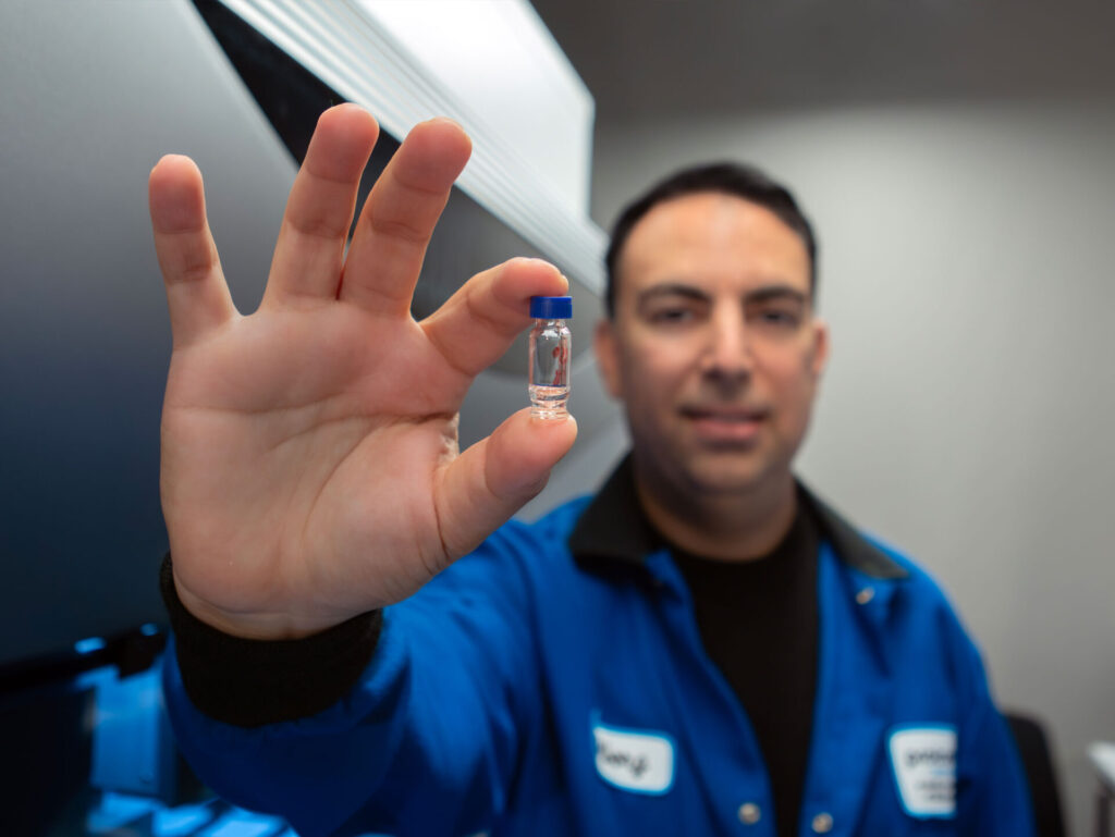 Photo by leah lee Alborz Mahdavi holding a small vial of a glucose sensing insulin analogue. The team designs and tests hundreds of such molecules every week, Mahdavi says large datasets generated from such high throughput screening efforts is a big enabler for machine learning-based drug development. The Pasadena-based team includes chemists, biologists, computer scientists and engineers, all working together with complementary skill sets. Mahdavi says this type of approach wasn’t even possible a decade ago, recent developments in connected systems and machine learning is enabling faster development cycles and hopefully better drug molecules in the future.